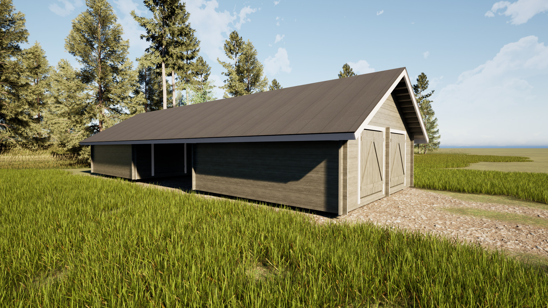 Kuvassa näkyy parilato suorilla katetuilla seinillä koossa XXL. 25 m² x 2 = 50 m² + 20 m² katettua välivajaa antaa yhteensä 70 m² säilytystilaa.